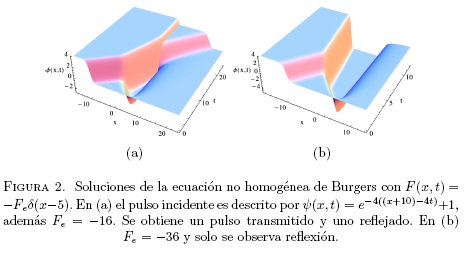 permite obtener la solución con N pulsos. En la Figura 1(a) se presenta una solución solitónica y en la Figura 1(b) se presenta la interacción de dos solitones. Se nota que la velocidad del soliton resultante después de la interacción es diferente a la de los dos solitones iniciales. Las soluciones presentadas en esta sección son dos grupos de soluciones que se conocen para la ecuación de Burgers homogénea [7, 8]. En la siguiente sección se estudia la forma en la que varían estas soluciones al introducirse la fuerza F(x,t) en (1).