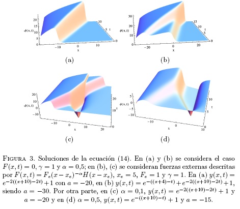 , lo cual es equivalente a quitar la barrera de potencial y en consecuencia la ecuación (33) no tiene soluciones solitónicas. En la Figura 3(c) se grafica la interacción de un pulso con una barrera de fuerza donde se presenta el pulso incidente pero en la interacción con la barrera no hay pulsos transmitidos. No obstante, si se compara con el resultado presentado en la Figura 2(a) se observa una similitud dado que los resultados del caso fraccionario deben coincidir con los del caso ordinario en el límite cuando el orden de la derivada tiende a un valor entero. En la Figura 3(d) la onda es reflejada e interacciona con la onda incidente tal como sucede en el caso ordinario. En este caso también se puede hacer que la barrera sea variable en el tiempo, tomando F(x, t) = f (t)(x - xe)-aH(x - xe), donde la solución numérica es presentada en la Figura 4 y muestra como mediante una fuerza oscilatoria con f (t) = Fe sin(ωt) el pulso incidente genera un pulso transmitido que pierde las características de pulso localizado y es dispersado.