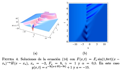 En la Figura 3(a) se presenta una solución con una onda localizada. Por otra parte, en la Figura 3(b) se presenta la interacción de dos pulsos. Dichos pulsos interaccionan de la misma manera que en el caso ordinario, sin embargo, el valor de α modifica la forma del pulso respecto al que se presenta en el caso ordinario. En la siguiente parte se busca estudiar la forma en la que varían estas soluciones al introducirse la fuerza F(x,t) en (14).