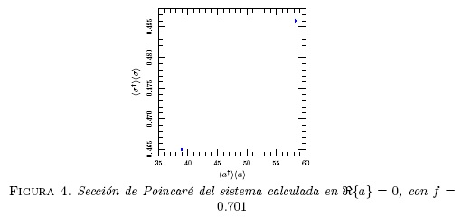 El primer caso a considerar es la denominada región periódica. La figura 3 muestra la evolución temporal de las intensidades Ia e Iσ, también se muestran el mayor y el menor exponente de Lyapunov. Dado que ambos exponentes de Lyapunov son negativos, en esta región del espacio de parámetros la solución del sistema tiene comportamiento periódico, esto también lo confirma la respectiva sección de Poincaré, figura 4. En esta, se muestra el cruce del flujo en el espacio de fase a través de un plano ubicado en ℜ{a} = 0, dicho cruce presenta una conglomeración de puntos en dos regiones muy pequeñas de la sección, lo que indica la existencia de una órbita de período 2.