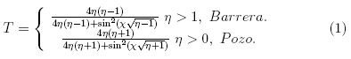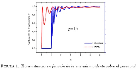 es la opacidad de la barrera o pozo. La figura 1, muestra el coeficiente de transmisión en términos de la energía incidente con respecto al potencial η, con x = 15, tanto para el pozo como para la barrera.