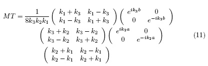 A partir de las condiciones de frontera de la función de onda proveniente de la ecuación de Shrodinger, y de los vectores de onda en cada una de las regiones, se puede escribir la matriz de transferencia como: