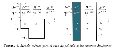 Como una aplicación se modela el sistema óptico aire-película-sustrato-aire, se calcula el coeficiente de transmisión y se muestran dos casos experimentales; su análogo cuántico es mostrado en la Figura 4.