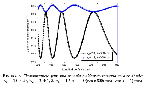 observe que los términos promediados son los senos y cosenos que describen la transmisión dada por el sustrato de espesor b, y sin promediar los términos asociados a la película delgada de espesor α. A continuación en la figura 5, se muestra la transmisión para diferentes valores de espesores α, e índices de refracción reportados por GALIFA[2].