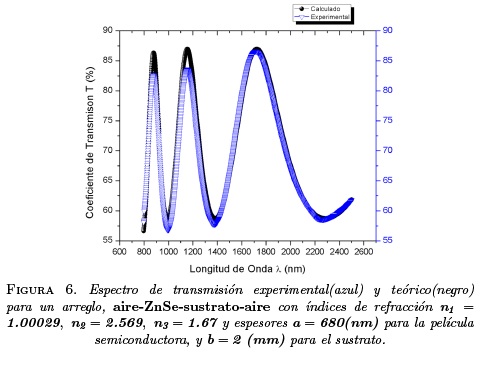 Ahora bien, aplicando el resultado teórico a medidas de transmitancia registradas en el laboratorio para la caracterización óptica de una película delgada de ZnSe, se busca modelar el espectro obtenido por métodos experimentales a través de la ecuación (12), con rangos de longitudes de onda incidentes de 800 a 2500 (nm), donde el valor del coeficiente de extinción ks del vidrio o sustrato es prácticamente nulo y teniendo en cuenta un comportamiento cuasi-constante para el índice de refracción de la película semiconductora y un débil coeficiente de absorción (α), se concluye que tanto la constante dieléctrica e y el correspondiente índice de refracción a estas frecuencias pueden considerarse reales y aproximadamente constantes [2] [9], la Figura 6 presenta los espectros de transmisión experimental y teórico.