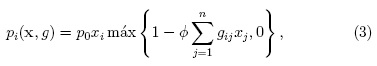 se refiere a la "perdida" debido a la posibilidad de que el individuo i sea capturado. Dicha ganancia o utilidad depende no solo de la estrategia adoptada por el individuo en consideración, sino también del esfuerzo de todos los demás individuos y de la estructura de la red. Esto se debe a la competencia global por recursos limitados y a la colaboración local entre individuos. Aquí p0 está relacionado con probabilidad de que un individuo genérico sea capturado, δ > 0 se relaciona con la intensidad de la competencia global, y φ ≥ 0 modela la intensidad de la colaboración y complementariedad local entre los individuos para evitar la aprehensión. Al producto p0 ƒ lo llamaremos πo, correspondiendo al parámetro que modela la intensidad de las sanciones impuestas.