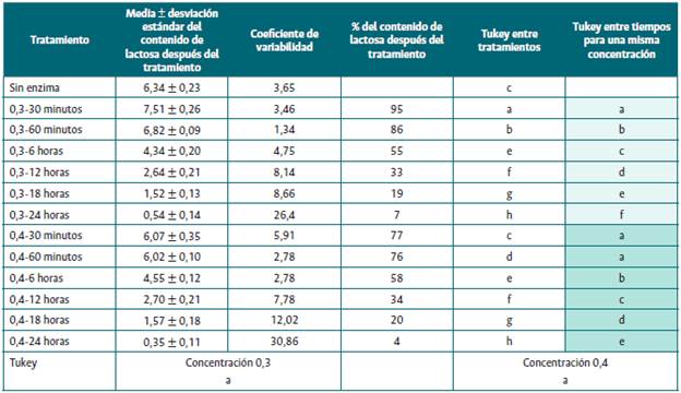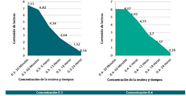 La Tabla 2 muestra los resultados de los efectos de los tratamientos sobre la lactosa a diferentes concentraciones de la enzima. A los 30 minutos y con una concentración de 0,3 %, el efecto de la enzima sobre la lactosa había sido solo de 5 %. Con dicha concentración, el efecto se empieza a evidenciar de forma más determinante tras 6 horas, con una disminución de 45 % en el contenido de lactosa, y luego de 24 horas, pues en este momento el contenido de lactosa es mínimo (7 %).