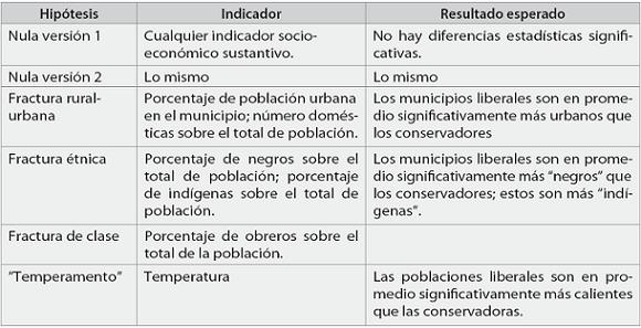 En esta sección presentamos un ejercicio cuantitativo que sugiere que, en efecto, los municipios de influencia liberal eran diferentes de los conservadores. Varias advertencias preliminares deben indicar sobre lo que puede y no puede ofrecer dicho ejercicio. Primero, no estamos en capacidad de dar un paso más allá de la identificación de los macro-patrones descritos arriba: carecemos de datos sobre los votantes individuales de uno y otro partido, y pretender describirlas deductivamente a partir de lo que sabemos sería una típica "falacia ecológica". Segundo, todo modelo estadístico es una aproximación provisional; sólo los chambones y los charlatanes los presentan como una "verdad" definitiva. Esto debe decirse con el mayor énfasis, porque desdichadamente en algunas áreas del conocimiento (17) se han generalizado las malas prácticas. Por supuesto, dicha provisionalidad no les quita su sentido (de hecho, lo mismo podría decirse de cualquier interpretación en una disciplina empírica). Son aproximaciones valiosas porque permiten presentar de manera rigurosa y muy sintética un paisaje agregado, en este caso de carácter socio-político, que sólo se podrá refinar utilizando mejores datos o mejores técnicas.