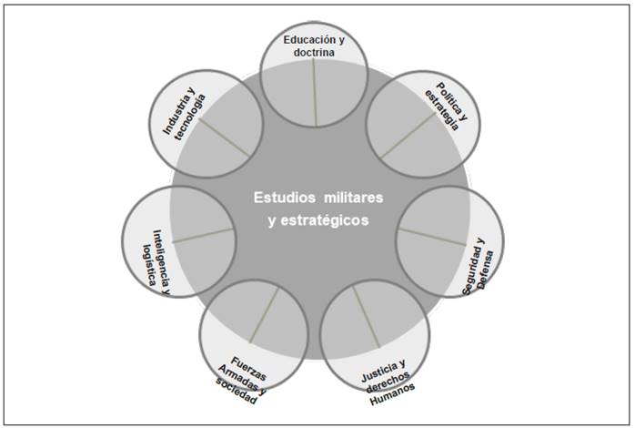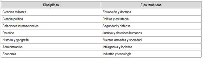 El ejemplo concreto de lo anterior puede verse mediante el proceso de reconocimiento en el ámbito regional de las revistas sobre estudios militares y estratégicos y las siete disciplinas que lo integran. Sin embargo, una ulterior delimitación de sus ejes temáticos ha de operarse para identificar las líneas directrices de este particular campo de estudios (véase tabla 1).