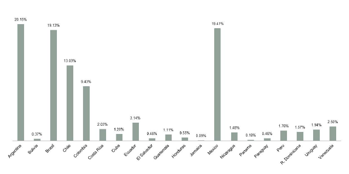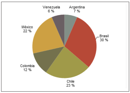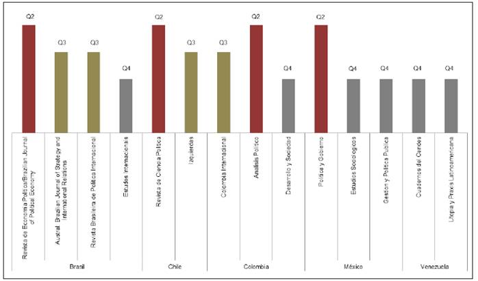 De estas 77 revistas solo 14 tienen calificación por cuartiles (Q1 a Q4) en concordancia con su índice de impacto y visibilidad internacional (siendo Q1 el cuartil para revistas de mayor producción de conocimiento académico e índice de citación). Aquí se destacan nuevamente cinco países por ser líderes en este aspecto: Brasil, Chile, Colombia, México y Venezuela (véase gráfico 4).