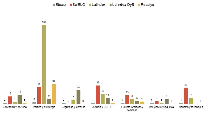 Al respecto, Latindex es la que mayor número de publicaciones registra en disciplinas atinentes a los estudios militares y estratégicos, como ciencia política y relaciones internacionales, con 380 títulos; seguidas de las incluidas en administración con 49, derecho con 44, historia y geografía con 32 y economía con 30. A esta base de datos le sigue SciELO, que clasifica 156 revistas, 52 de las cuales pertenecen a economía, 42 a ciencia política, 27 a derecho, 19 a administración y 16 a historia y geografía. Por último, Redalyc presenta una cantidad minoritaria de revistas, según una distribución que se reparte entre ciencia política y relaciones internacionales con 35 revistas, historia y geografía con 4 y administración con 1.