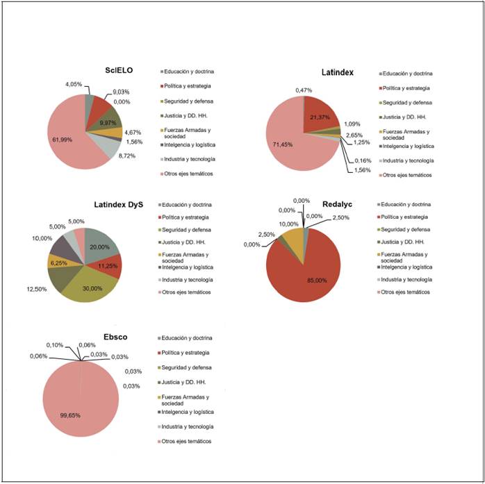 Las revistas del eje temático “Fuerzas Armadas y sociedad”, vinculado a historia y geografía, tienen una contribución del 4,7 % en SciELO, un 1,2 % en Latindex, un 6,3 % en Latindex Defensa y Seguridad, un 10 % en Redalyc y un 0,03 % en EBSCO. En el eje temático “inteligencia y logística” (administración), las revistas contribuyen en un 1,6 % en SciELO, un 0,2 % en Latindex, un 10 % en Latindex Defensa y Seguridad, un 0 % en Redalyc y un 0,03 % en EBSCO.