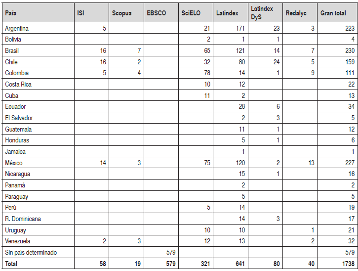 Tabla 2 Publicaciones seriadas por país en bases de datos seleccionadas para este estudio (ciencias sociales)