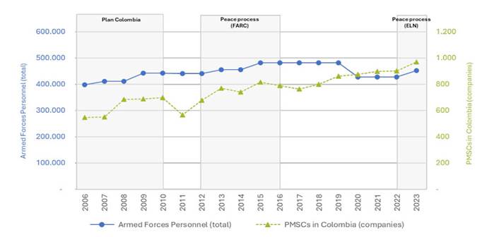 Figure 1 Comparison of personnel of the Colombian Armed Forces (Army, Navy, Air Force, and National Police) vs. PMSCs in Colombia (2006-2023).