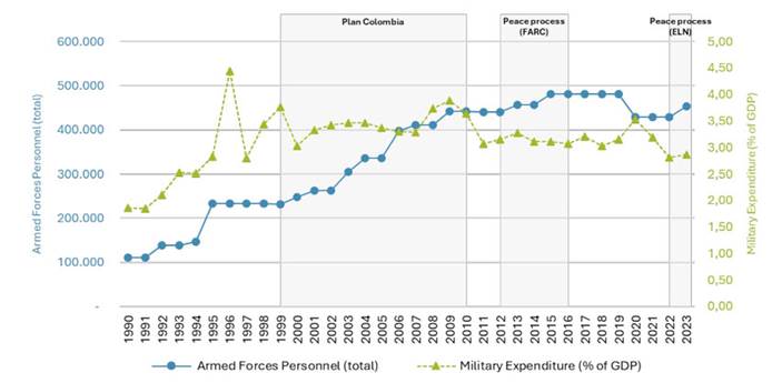 Regarding key trends and relevant events, during Plan Colombia (2000-2010), a sharp increase in troop numbers is observed, reflecting the impact of U.S. military support and the intensification of the fight against insurgent groups. On the other hand, a peak in military spending is evident (~2003-2004), which coincides with an escalation in the war against the FARC and other armed groups. Subsequently, relative spending decreases and rebounds, reflecting fiscal adjustments and strategic priorities. During the peace process with the FARC (2012-2016), while military personnel continued to increase or remain stable, military spending as a percentage of GDP stabilized or declined slightly. This may indicate a reorientation of the budget toward other sectors in anticipation of a peace settlement. Finally, in the post-agreement phase with the FARC and the process with the ELN (beginning around 2017), a reduction in Armed Forces personnel and a notable drop in military spending as a percentage of GDP are observed, possibly due to cost-cutting efforts following the demobilization of the FARC.