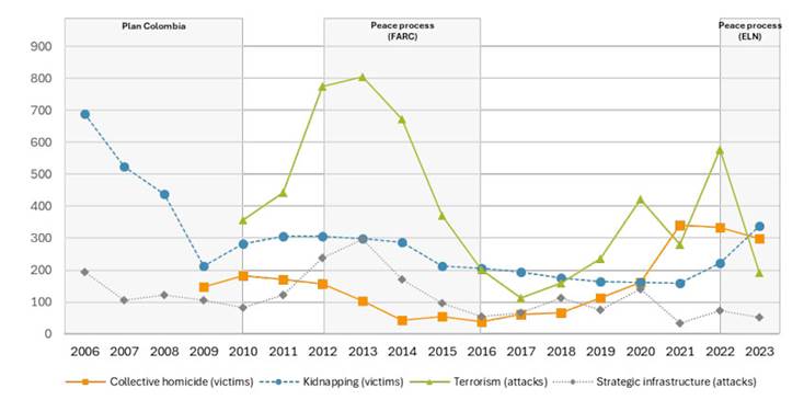 Figure 3 Progression on security threats in Colombia (2006-2023).