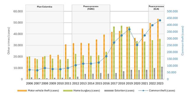 On the other hand, security threats generated by dissidents and criminal organizations started to migrate towards less noticeable and more profitable urban activities (Alvarez-Calderon et al., 2022), such as motor vehicle theft, common theft, home burglary, and extortion, producing a notable rise in cases and victims (Figure 4).