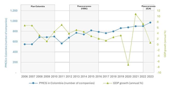 Figure 5 Comparison of PMSCs in Colombia vs. GDP growth (2006-2023).