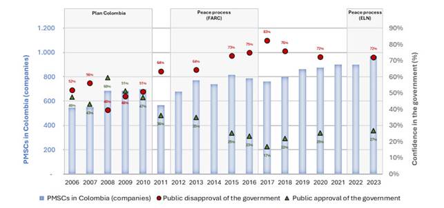 Figure 6 Comparison of PMSCs in Colombia vs. confidence in the Colombian government (2006-2023).