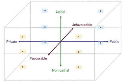 The third axis added to Professor Kinsey's model represents the public's support or perception of the object regarding favourability or non-favourability. As a result, the axes divide the plane into four quadrants. The front right-hand quadrant is divided into three parts (top, centre, and bottom, numbered 1, 2, and 3). It represents the PMSCs that offer security and defence services to the State, having the capability of lethal or non-lethal responses with favorable support from public opinion. In this sector, it may be localized PMSCs with non-lethal capability in charge of humanitarian demining, such as The Halo Trust, Humanity & Inclusion, Norwegian Popular Aid (APN), Colombian Campaign Against Mines (CCCM), Colombian Association of Technicians and Experts in Explosives and Fire Researchers and NBQR (ATEXX), Perigeo NGO, Danish Demining Group (DDG), and Polus Centre (Descontamina Colombia, 2019).
