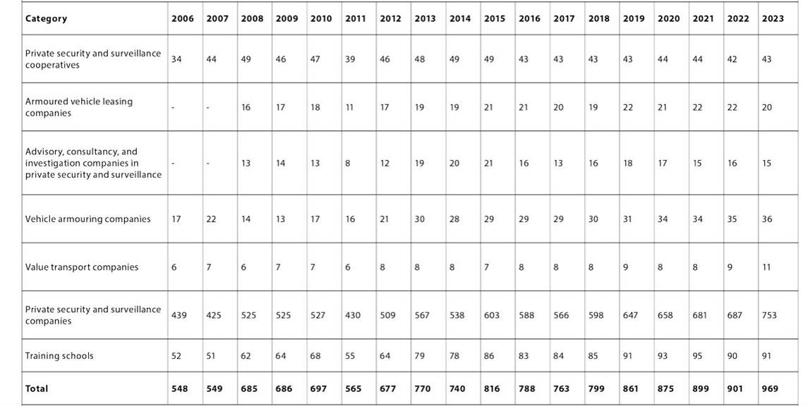 The SSPS has structured its oversight on five areas: 1) Surveillance and security in all its forms, 2) Transport of values, 3) Armouring for surveillance and private security, 4) Community and special surveillance and private security, 5) Training in surveillance and private security (2024b), but it offers limited, and sometimes, inconsistent data about PMSCs’ development and status. These oversight areas suggest seven types of PMSCs in Colombia, as reported annually by the SSPS (Table 1); however, they do not provide an adequate typology to characterize PMSCs in Colombia and their capabilities.