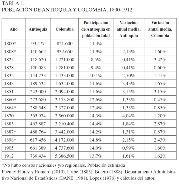 El patrón de crecimiento antioqueño parece haber estado asociado al surgimiento de una clase media propietaria y a un significativo aumento de la población. Aquel incremento demográfico fue excepcionalmente alto dentro del contexto colombiano (Tabla 1), y aunque no resulta muy clara la dirección causal de su vínculo con el crecimiento económico5, ha sido interpretado por algunos autores, entre ellos Kalmanovitz (2008), como una evidente señal de mejores condiciones de nutrición, salud y educación en la región.