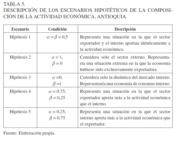Identificar los valores de α y β es una labor empírica. Para ello, habría de realizarse un análisis cuidadoso de la composición de la actividad económica de la región y un ejercicio completo de inferencia estadística. Puesto que el interés de este trabajo se centra en la evaluación del nivel de actividad económica y no en el de su estructura, trataremos de aproximarnos a escenarios hipotéticos generales, empleando la literatura en el tema para identificar cuáles de ellos habrían sido probables. En la Tabla 5, se describen dichos escenarios.