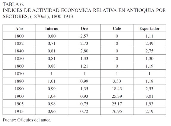El comportamiento del sector exportador fue el resultado de la reducción en el indicador del sector aurífero a partir de 1850 y del posterior incremento del indicador cafetero. La reducción del indicador del oro reflejó, más que la pérdida de dinamismo del sector en Antioquia, el descenso de la participación del oro en el valor de las exportaciones totales del país. Por otra parte, el indicador del café creció de forma espectacular desde 1880, gracias al aumento de la producción en la región, la participación del café en las exportaciones totales y el incremento del precio (esto para la segunda década del XX).