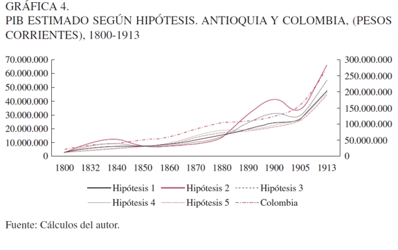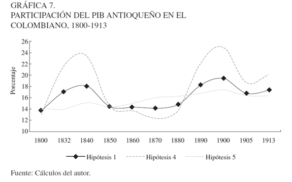 La discusión exige, además, definir en qué términos se está hablando del éxito económico regional. En términos absolutos, los periodos de mayor crecimiento habrían sido 1860-1880 y 1906-1913. En términos relativos, con respecto a la economía colombiana, los periodos exitosos de Antioquia habrían sido 1800-1840 y 1880-1900. Por otro lado, si se estuviera hablando en términos per cápita, los periodos de mejor desempeño habrían sido 1800-1840 y 1906-1913.