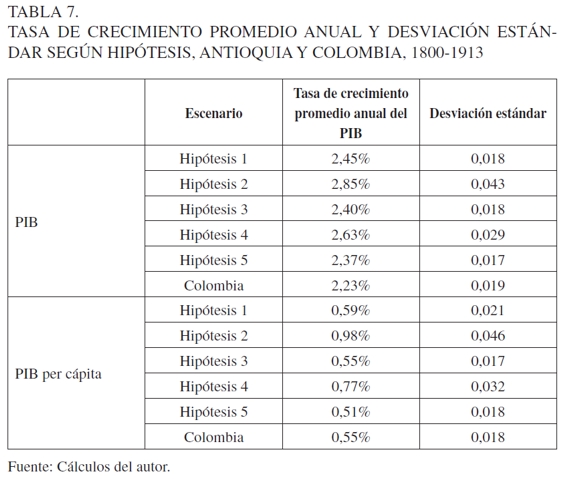Se han encontrado elementos para dar respuesta a la larga disputa sobre el inicio del despegue antioqueño. Se evidencia que Antioquia, ya para comienzos del siglo XIX era una región rica en el contexto colombiano, y que reportaba además tasas de crecimiento superiores a las del conjunto del país entre 1800 y 1913. Es decir que el nivel de actividad económica per cápita de Antioquia siempre se mantuvo por encima del de Colombia, de manera que, en realidad, nunca habría existido, en el periodo en cuestión, tal cosa como un momento preciso en el que Antioquia pasara de ser pobre a rica. La identificación de dicho evento seguramente ha de buscarse en el auge minero de la segunda mitad del siglo XVIII.