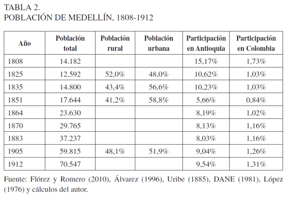 Considerar la dinámica demográfica de Medellín aporta luces sobre esta cuestión (Tabla 2). A diferencia de lo que suele afirmarse, el crecimiento poblacional de Medellín no tuvo nada de espectacular en términos relativos. El acelerado proceso de urbanización de Medellín de la segunda mitad del siglo XIX apenas llegó a compensar la importancia poblacional que la ciudad había adquirido a finales del siglo XVIII (Escobar, 2009). De hecho, su crecimiento no fue especialmente alto, si se compara con el de otras ciudades como Barranquilla o Cali (Flórez y Romero, 2010).