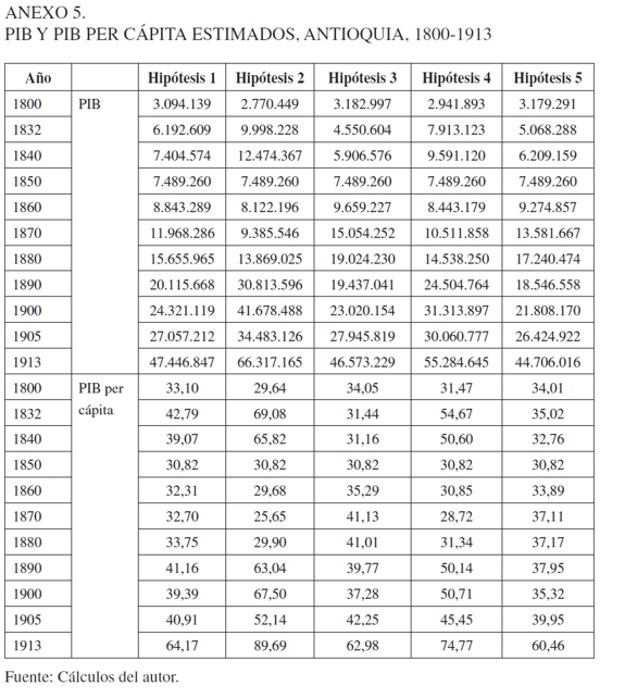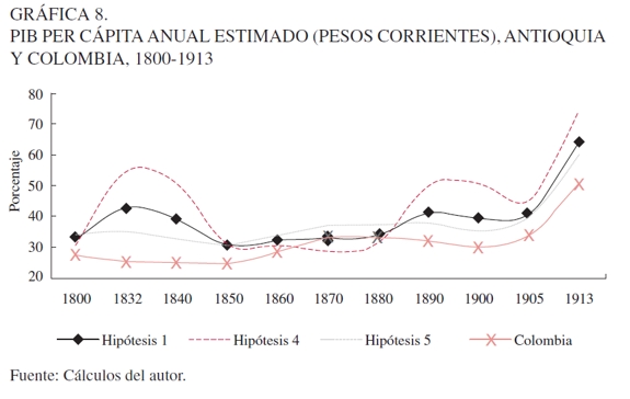 Hasta donde se sabe, solo existe una estimación del PIB per cápita para Antioquia durante el siglo XIX (un solo dato), construida por Robinson y García-Jimeno (2010) a partir de registros tributarios, que afirma que hacia 1850 el ingreso per cápita habría sido de 30,82 pesos corrientes anuales. Mientras que Robinson y García-Jimeno (2010) y Mejía (2011), con base en las estimaciones de ingreso percápita colombiano de 1861 elaboradas por Camacho Roldán (43 pesos anuales), descartan que el despegue antioqueño hubiese iniciado antes de la segunda mitad del siglo XIX, al tomar como referencia los cálculos del PIB per cápita de Kalmanovitz y López (2010) (24,8 pesos), es posible considerar que, ya hacia 1850, Antioquia habría sido una región más rica que el promedio colombiano.