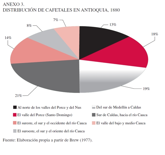 En todo caso, más allá de la disputa concreta sobre la temporalidad y causas del despegue económico, la literatura parece coincidir en un patrón concreto de evolución de la actividad económica, que partiría del auge en la minería de oro y plata en la primera parte del siglo XIX, prosiguiendo con el ascenso de la economía comercial, la banca y, finalmente, la industria. El cultivo y comercialización del café, aunque menos claramente definido dentro de aquella secuencia, ha sido reconocido también como uno de los sectores líderes en la región, desde por lo menos el último par de décadas del siglo XIX (Fernández, 2013).