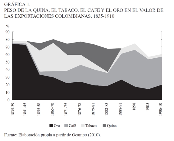 El tabaco disfrutó de un auge hacia la década de 1860; además de las favorables condiciones de la demanda internacional, fomentado por la liberalización local del sector. La quina tuvo un boom que inició hacia 1870, con un pico en la década de 1880 y un abrupto descenso a partir de ese momento. El oro, aunque perdió importancia en términos relativos durante el siglo, fue de gran importancia, de hecho, según las cifras de Reagan (1982), Colombia fue el mayor productor aurífero mundial entre 1800 y 1830 (Anexo 2), periodo a partir del cual el valor total de su exportación se mantuvo bastante estable. Finalmente, el café disfrutó de un ascenso sostenido desde la segunda mitad del siglo XIX, y se convirtió en el principal rubro de exportación en el XX.
