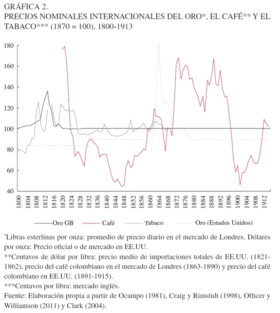 La Gráfica 2 presenta la evolución de los precios internacionales de dichos bienes. Para empezar, los precios del oro se mantuvieron excepcionalmente estables en el transcurso del siglo XIX, con dos únicos picos importantes: en el mercado londinense durante las guerras napoleónicas y en el americano durante la Guerra de Secesión. Por el contrario, el precio internacional del café fluctuó significativamente durante todo el periodo, con un auge entre las décadas de 1870 y 1890, y una caída importante hacía la entrada del siglo XX. La volatilidad también caracterizó el precio del tabaco, que sin embargo presentó sus mayores picos en periodos ajenos al auge exportador colombiano. A pesar de ello, el auge exportador tabacalero aprovechó el aumento de los precios internacionales en los sesenta, debido a la desorganización de la producción en Virginia y Maryland, también durante la Guerra de Secesión. Las series de precios internacionales para la quina son algo más escasas e imprecisas, no obstante, es claro que estos colapsaron a partir de 1882 a causa de las plantaciones establecidas en Java y Ceilan (Ocampo, 1984; Sastoque, 2011).