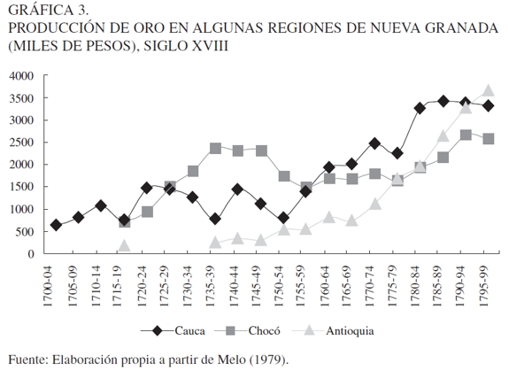[68] Urrutia, M, & Ortiz, J. F. (2010). El oro en la Nueva Granada del siglo XVIII. Auge minero y desarrollo regional. Documento presentado en Seminario de Economía Colonial, Banco de la República, Bogotá [ Links ].