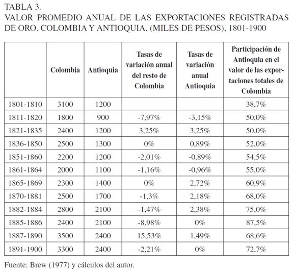 En el siglo XIX, la minería continuó aumentando su importancia en la actividad económica antioqueña. Según Restrepo (1888), la producción de oro en Antioquia durante el siglo XIX (137 millones de pesos) duplicó la del siglo XVIII (64 millones de pesos), sobrellevando con bastante estabilidad las dificultades del conflicto independentista13 (Tabla 3). Al empezar el siglo, las exportaciones de oro de Antioquia representaban cerca del 39% de las de todo el país, y llegaron a más del 72% al terminarlo. Así mismo, es posible observar que la producción en Antioquia fue mucho más estable que en el resto de la nación: mientras que para Antioquia la desviación estándar de la tasa de variación anual fue de 0,019, para el resto del país fue de 0,069, aun cuando la contracción de la producción fue mucho menor durante el periodo independentista (1811-1820) y entre 1851 y 186414.