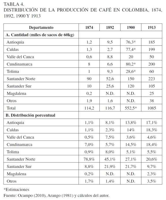 En el último cuarto del siglo XIX, el café empezó a cobrar importancia dentro de la actividad económica, que floreció vigorosísimamente en muy poco tiempo y cobró especial fuerza en el sur de la región (Anexo 3). En la Tabla 4 se puede observar el proceso en el que Antioquia (incluyendo Caldas) pasó de producir algo más del 2% del café del país en 1874 a casi el 36% en 1913, año en el que se vivió el primer boom cafetero en el país (Greco, 2004).