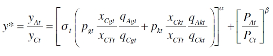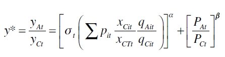 Este indicador (y*) propone la razón entre los productos de Antioquia y Colombia como una razón de los ingresos generados en el sector externo (primer corchete) y en el interno (segundo corchete). Los parámetros α y β representarían la importancia del sector exportador y el interno, respectivamente, en el producto interno bruto.