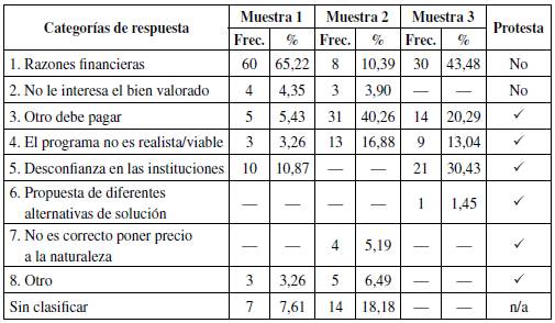 Por fines comparativos, las razones de quienes no estuvieron dispuestos a pagar se agruparon en ocho categorías (Tabla 2). Las dos primeras no se clasifican como razones de protesta por cuanto encajan dentro con una interpretación económica estándar del valor (antropocéntrica y utilitarista). Es decir, son producto de restricciones presupuestales (por ejemplo, la expresión "es una suma de dinero muy alta para mí" en la Muestra 1) o de desinterés por el bien en cuestión (por ejemplo, la expresión "la protección del río no es importante para mí" en la Muestra 2).