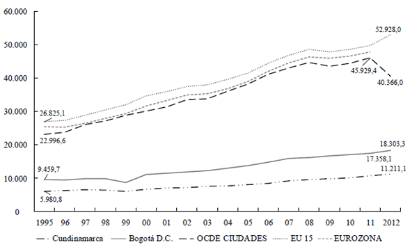 Gráfica 1a PIB per cápita de Bogotá frente a OCDE 1995-2012