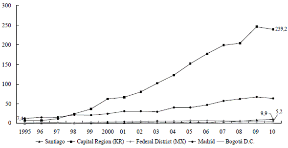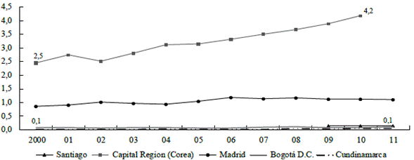 Frente a capitales de países emergentes de rápido crecimiento, como Seúl, la ampliación de la brecha es mayor: en 2011 superaba en 12,5 veces la participación del gasto bogotano en I+D frente al PIB (Gráfico 4b). Esto evidencia las profundas transformaciones y desarrollo tecnológico en Seúl frente al persistente marasmo bogotano. Tal situación no parece exclusiva de Bogotá, pues en Santiago se repiten tanto su estancamiento como su creciente rezago frente a las capitales de los países desarrollados.