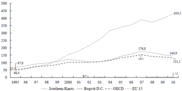Gráfica 7b Número de patentes aplicadas PCT frente a regiones emergentes 1995-2010 (Por millón de habitantes)