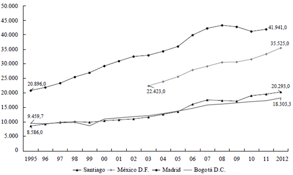Gráfica 2a PIB per cápita de Bogotá frente a Iberoamérica 1995-2012
