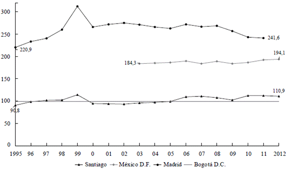 Gráfica 2b Brechas en el PIB per cápita de Bogotá frente a Iberoamérica 1995-2012 (Referente: Bogotá, D.C.)