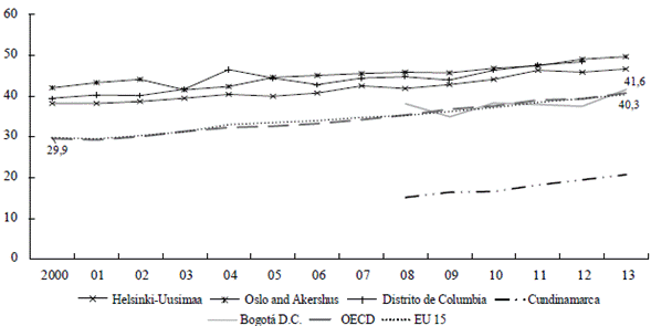 Para lograr los objetivos propuestos, se compara a Bogotá1 con sus pares -capitales-regiones- tanto de los países de la OCDE como de la Unión Europea; la comparación se hace mediante la identificación, propuesta y aplicación de sets de indicadores para cada uno de estos casos2. Los ejercicios revelan, por una parte, notables ventajas del marco europeo y, por otra, brechas relativas que indican que la CTI -en las condiciones actuales- lejos de cerrar, contribuyen a ampliar el enorme rezago económico de ByC frente a sus pares.