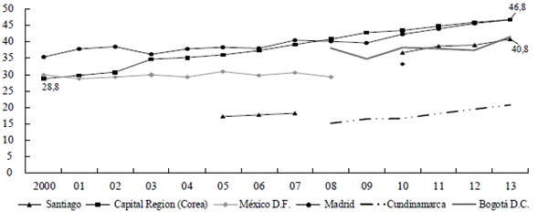 Una comparación general e inevitable de Bogotá frente a las regiones pares -antes de su ingreso a la OCDE- la aporta el PIB per cápita: el indicador más básico14 e institucionalizado para comparar los niveles de desarrollo de países y regiones. Según este, Bogotá apenas alcanza el 40% del promedio de la OCDE y, lejos de reducirse, esa brecha se amplía paulatinamente (Gráfica 1a). La Tabla 4a indica, además, que, Bogotá tiene un PPP inferior al de ciudades capitales latinoamericanas que integran la OCDE, como Ciudad de México y Santiago de Chile, y que ese atraso está creciendo.