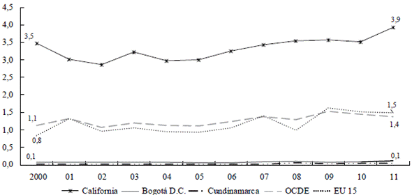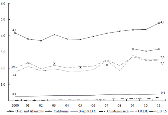 El comportamiento del gasto en I+D como proporción del PIB regional es opuesto. Las regiones de los países desarrollados presentan aumentos progresivos, aunque en la OCDE son inferiores a los registrados en la Unión Europea, especialmente en los países nórdicos (Gráfico 4a); los aumentos de Seúl fueron tan vertiginosos que desde 2011 duplican el promedio de la OCDE. En abierto contraste, en Santiago y Bogotá, los niveles del gasto son marginales y permanecen estancados. Por ello, la brecha no solo es sustancialmente mayor que la registrada en el PIB -el PIB de la OCDE supera en 2,5 veces el de Bogotá en 2011, mientras el gasto en I+D como proporción del PIB, en 6,25 veces-, sino que ha venido ampliándose.