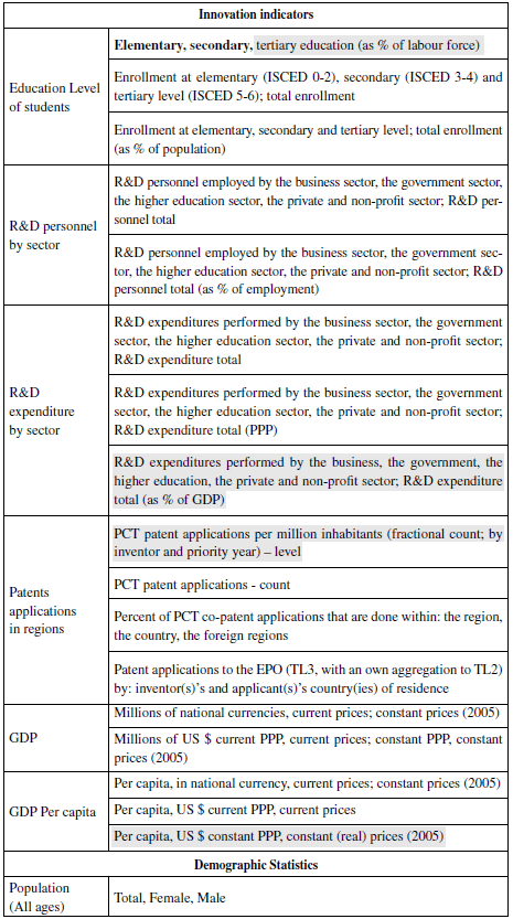 En la base de datos de la OCDE, se identificaron los indicadores directamente relacionados con CTI, y por parsimonia se seleccionaron los esenciales -sombreados en la Tabla 1- para dar cuenta del desempeño de ByC frente a sus pares. Así, se conformó un set core de indicadores factibles de estimar y comparar internacionalmente. Estos corresponden a inputs -nivel de educación de la población y la dedicada a la I+D, así como los gastos en esta actividad- y un output -patentes- (Tabla 1).