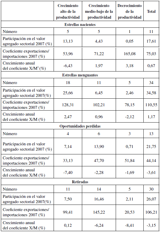 En este orden de ideas, en la Figura 4, el cuadrante superior derecho contiene las clases que exhiben características de competitividad auténtica en el periodo, en concreto, altos incrementos de la productividad laboral y aumentos del valor agregado y del coeficiente de exportaciones sobre importaciones. La Tabla 4, por su parte, registra estos 16 casos que representaron, en 2007, solo 16,8 % de las exportaciones sectoriales y 22 % del valor agregado total del sector. Destacan las categorías "destilación, rectificación y mezcla de bebidas alcohólicas" (1551) y "partes y accesorios para vehículos" (3430), únicas con alzas promedio anuales superiores a 10 % en la generación de valor añadido y a 5 % en el coeficiente de comercio exterior. La observación relevante es que, si bien 15 de estas 16 actividades con competitividad auténtica incrementaron su cuota de mercado internacional, 11 de estas son estrellas menguantes, es decir productos cuya participación en el comercio mundial fue en declive. Este resultado confirma la ausencia de dinamismo en el patrón exportador.